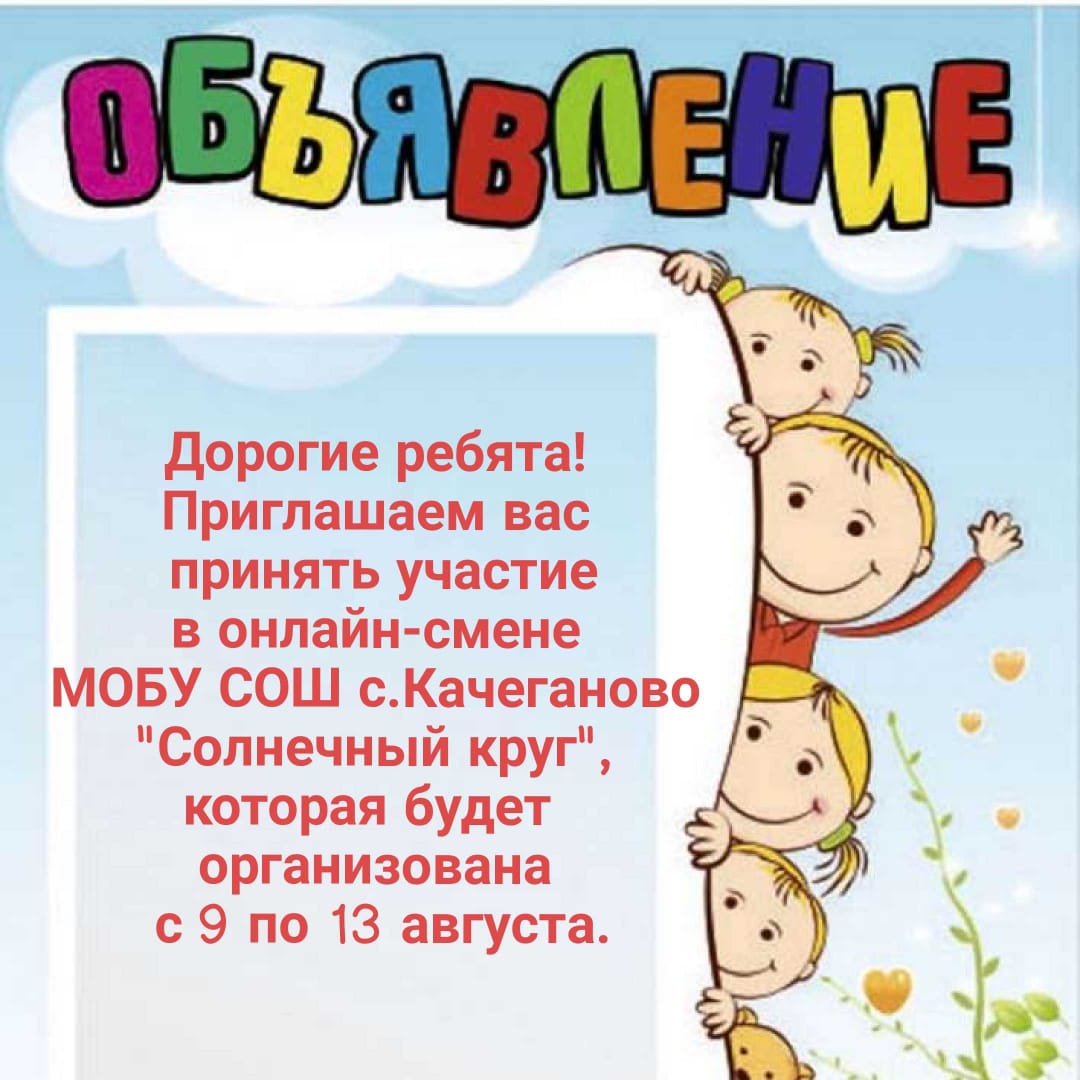 Дорогие ребята, приглашаем вас принять участие в онлайн смене МОБУ СОШ с. Качеганово "Солнечный круг" с 9 по 13 августа. Для этого перейдите по ссылке: